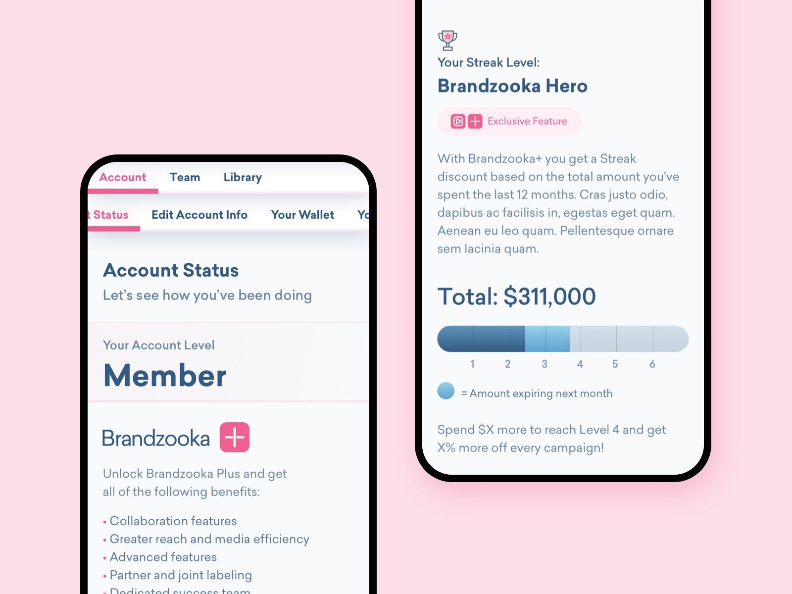 In the process of expanding the features of the Brandzooka platform prior to Brandzoka's Series A, we drastically enhanced our account settings functionality. In addition to an improved UX for existing account settings, we added a new product, Brandzooka+. This allowed users to collaborate on teams, manage employees accounts, grey label our platform with a new color scheme and branding, gamify Brandzooka spending, and more.